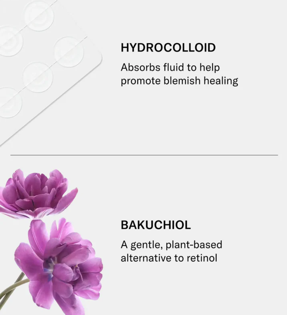 Developed with dermatological expertise, our invisible pimple patches combine Hydrocolloid technology with Bakuchiol, a plant-based alternative to retinol known for its soothing and restorative power.